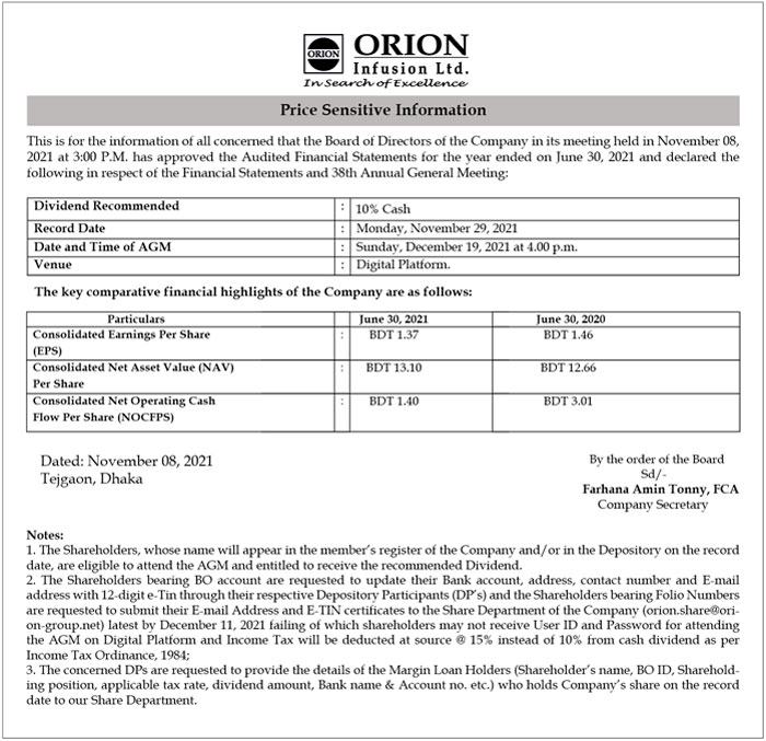Price Sensitive Information of Orion Infusion Ltd