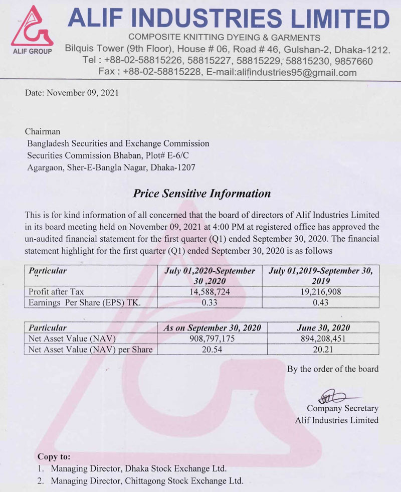 Price Sensitive Information of Alif Industries Limited