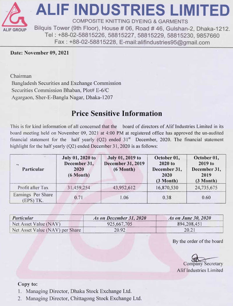 Price Sensitive Information of Alif Industries Limited