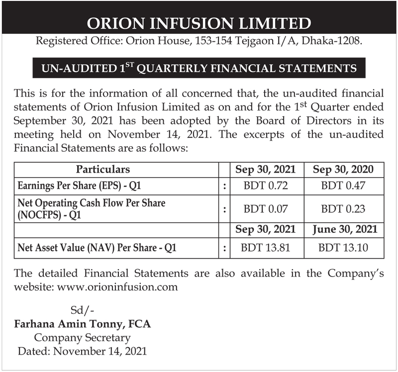 Price Sensitive Information of Orion Infusion Ltd