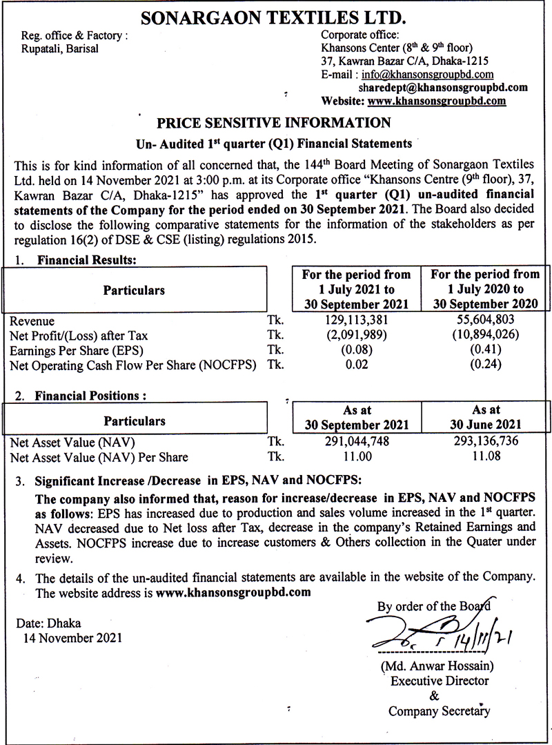 Price Sensitive Information of Sonargaon Textiles Ltd.