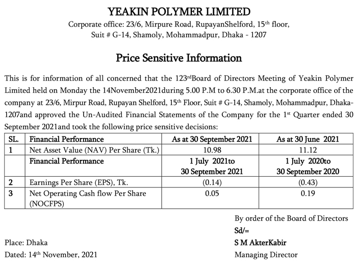 Price Sensitive Information of Yeakin Polymer Limited