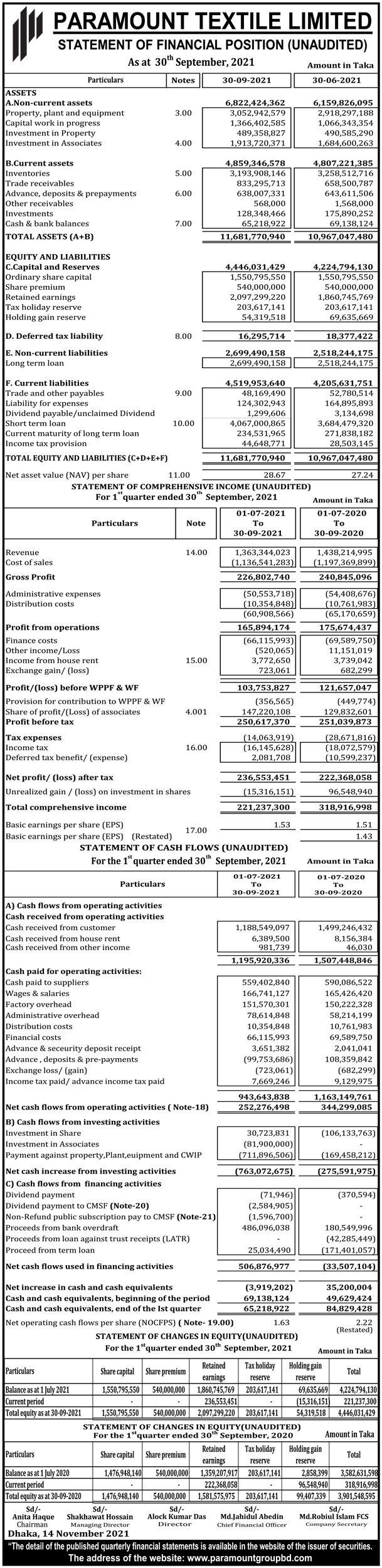 Statements of Financial Position (Un-audited) of Paramount Textile Limited.