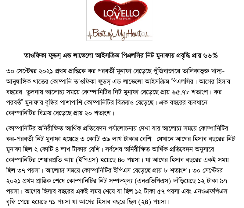 Price Sensitive Information of Taufika Foods And Lovello Ice-Cream Plc.