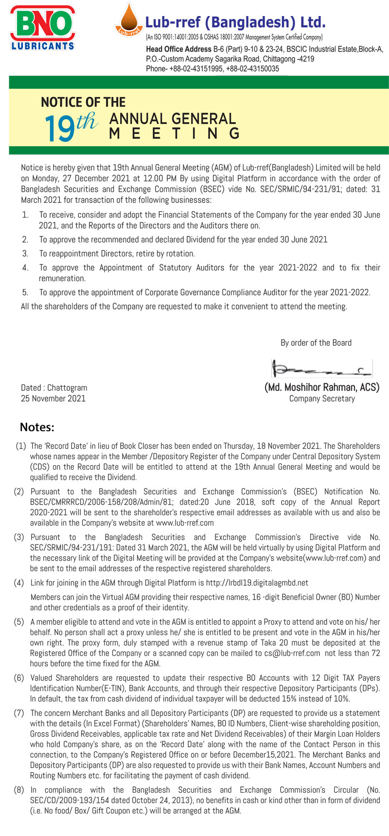 Notice of the 19th AGM of Lub-rref (Bangladesh) Ltd.