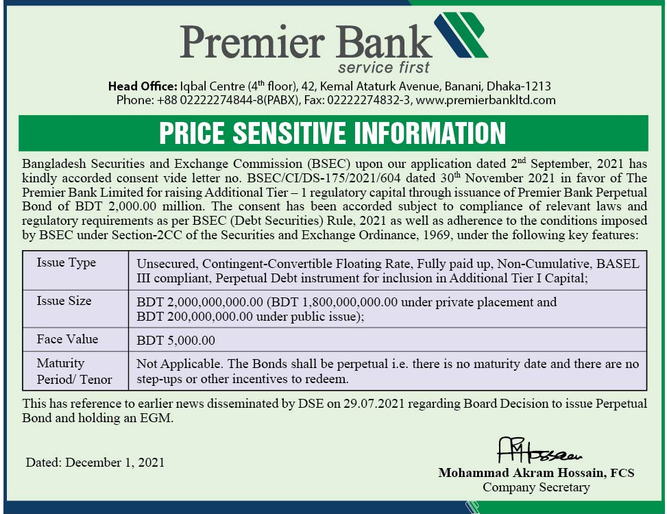 Price Sensitive Information of Premier Bank