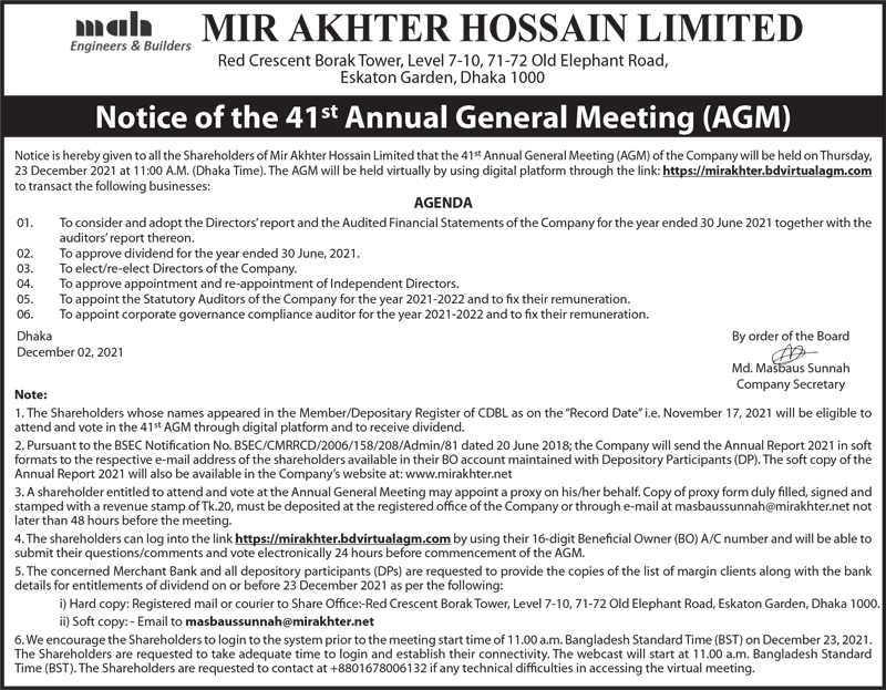 Noitce of the 41st AGM of Mir Akhter Hossain Ltd.