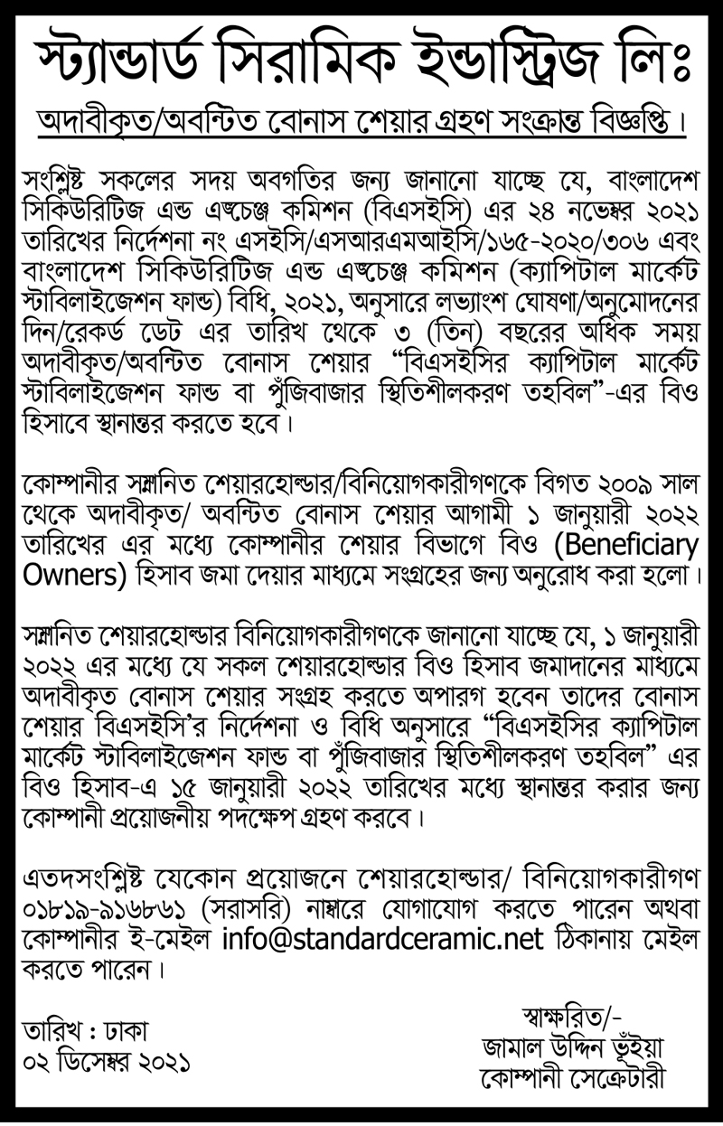 Notice for Unclaimed Dividend of Standard Ceramic Industries Ltd