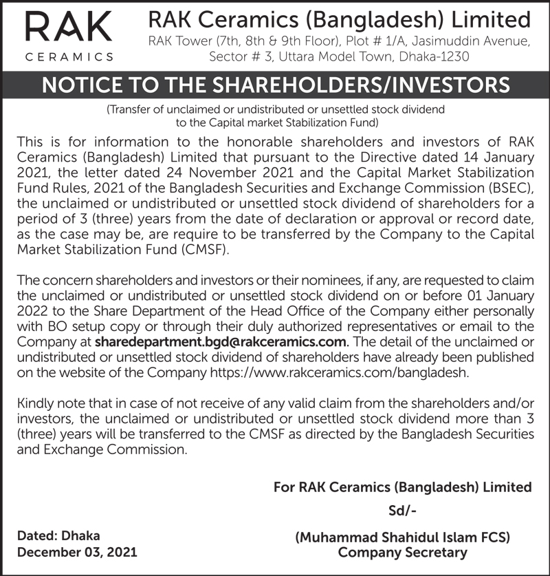 Notice to the Shareholders/Investors of RAK Ceramics (Bangladesh) Ltd.
