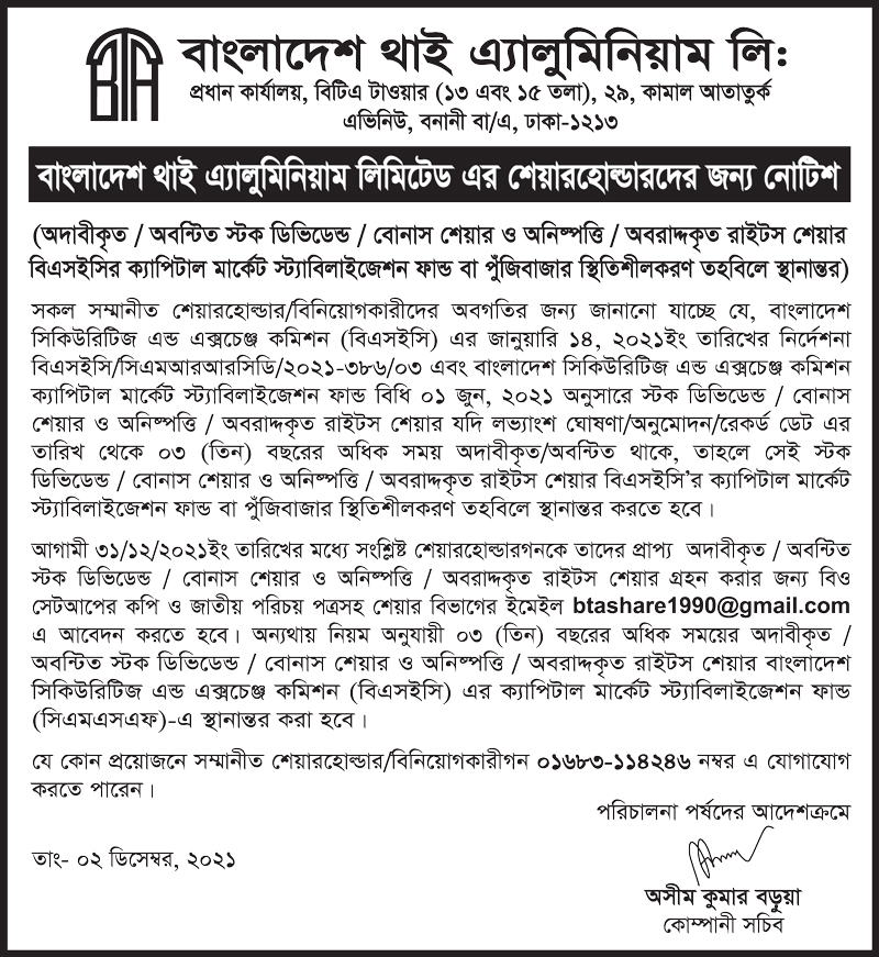 Notice to the Shareholders of Bangladesh Thai Aluminium Ltd.