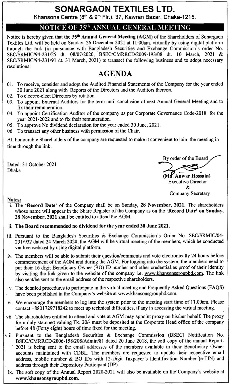 Notice of 35th AGM of Sonargaon Textiles Ltd.