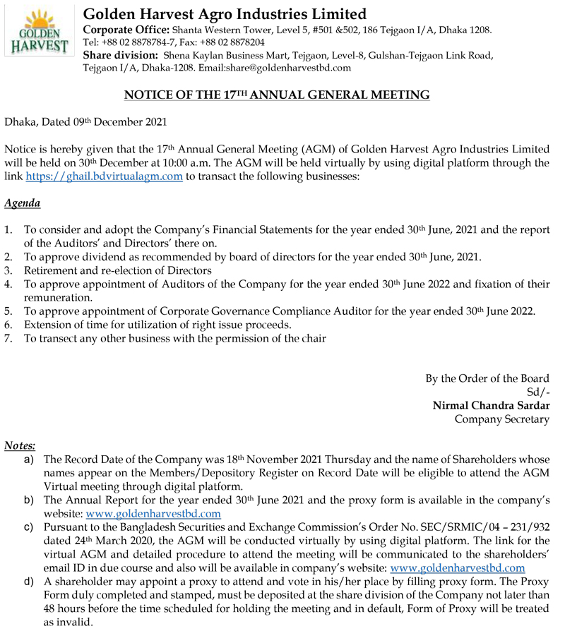 Notice of the 17th AGM of Golden Harvest Agro Industries Ltd