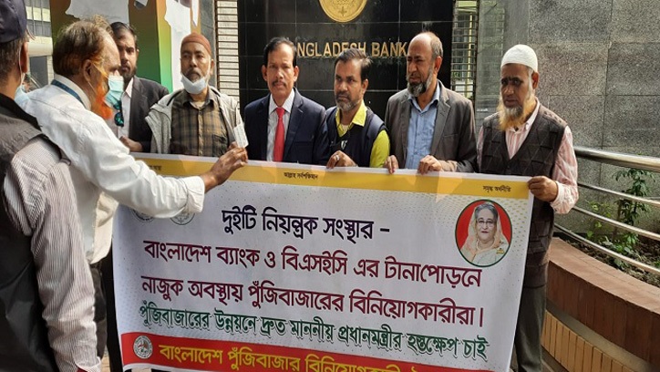আজ মঙ্গলবার (২৮ ডিসেম্বর) দুপুর ১টার দিকে রাজধানীর মতিঝিলে বাংলাদেশ ব্যাংকের সামনে বাংলাদেশ পুঁজিবাজার বিনিয়োগকারী ঐক্য পরিষদ থেকে আয়োজিত প্রতিবাদ কর্মসূচির মাধ্যমে এ দাবি জানানো হয়েছে। কর্মসূচিতে নেতৃত্ব দেন সংগঠনের সাধারণ সম্পাদক কাজী আব্দুর রাজ্জাক। এ সময় সংগঠনের ২০ সদস্য উপস্থিত ছিলেন।