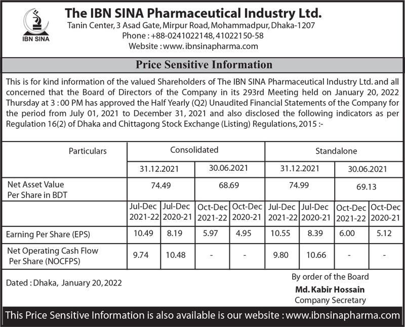 Price Sensitive Information of The IBN SINA Pharmaceutical Industry Ltd.