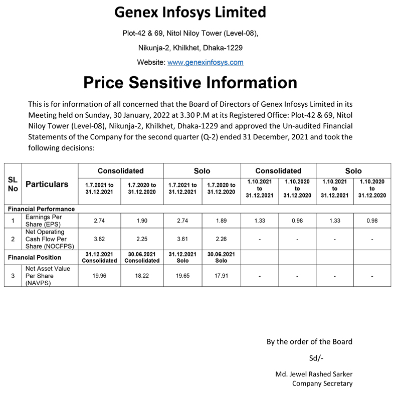 Price Sensitive Information of Genex Infosys Limited