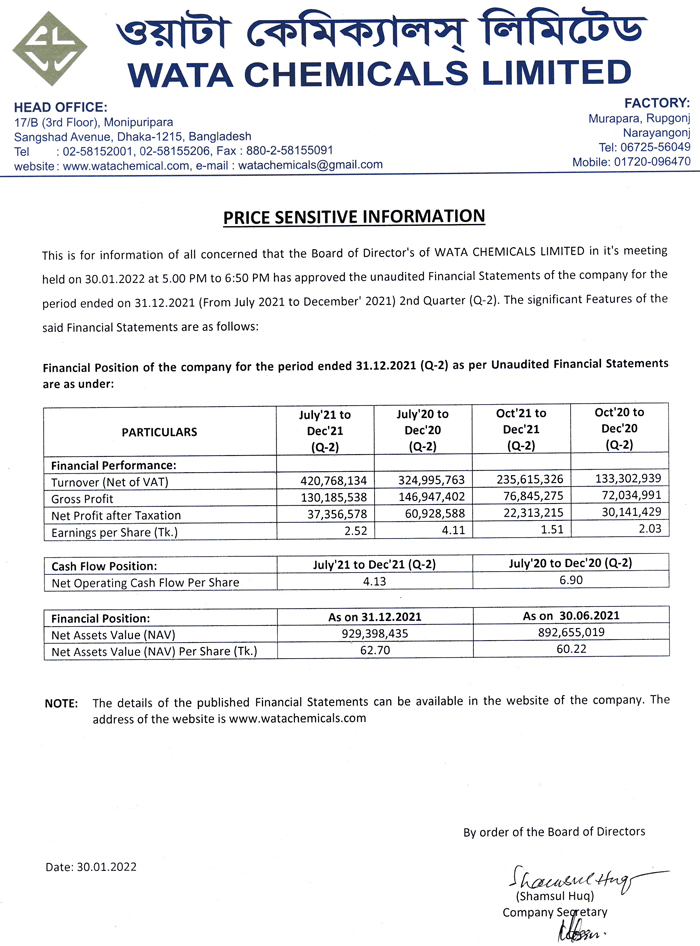 Price Sensitive Information of Wata Chemicals Limited