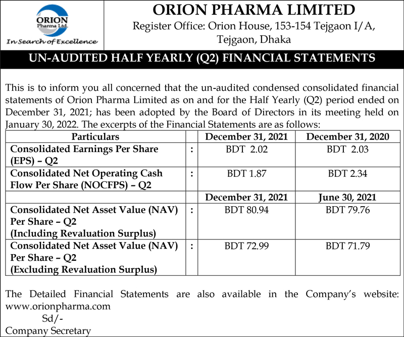 Q2 Un-audited Financial Statements of Orion Pharma Ltd