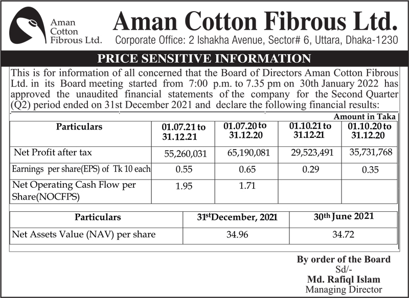 Price Sensitive Information of Aman Cotton Fibrous Ltd.