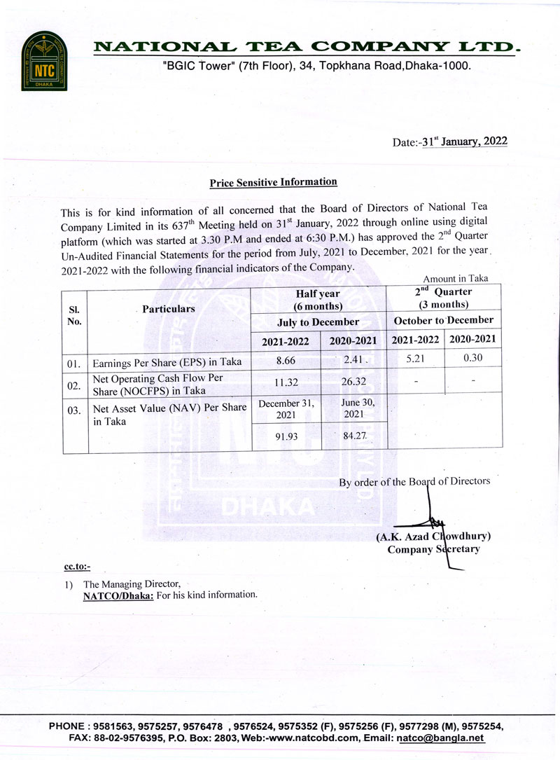 Price Sensitive Information of National Tea Company Limited