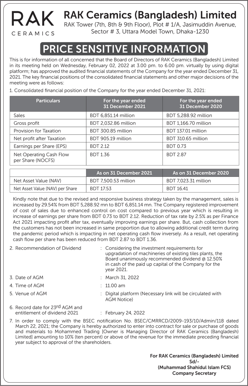 Price Sensitive Information of RAK Ceramics (Bangladesh) Limited