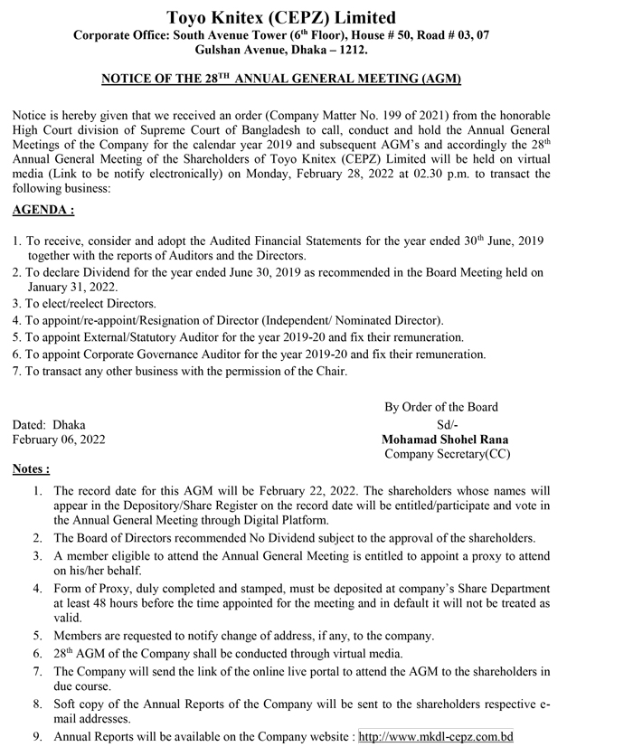 Notice of the 28th AGM of Toyo Knitex (CEPZ) Limited