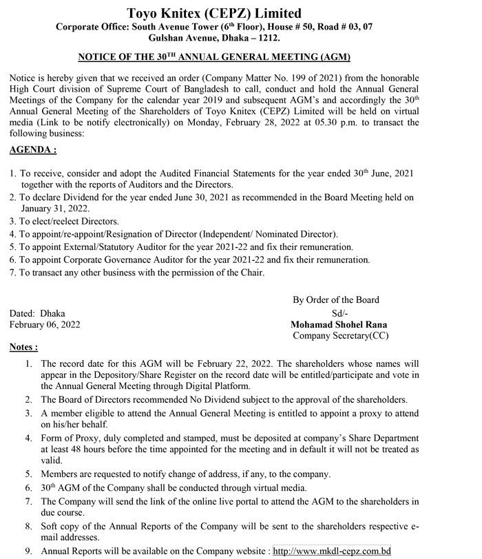 Notice of the 30th AGM of Toyo Knitex (CEPZ) Limited