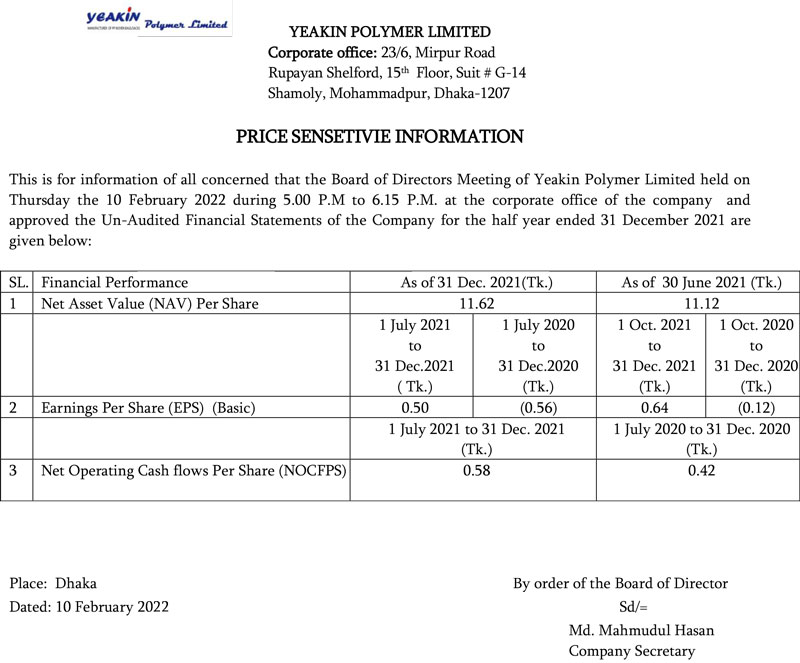 Price Sensitive Information of Yeakin Polymer Limited