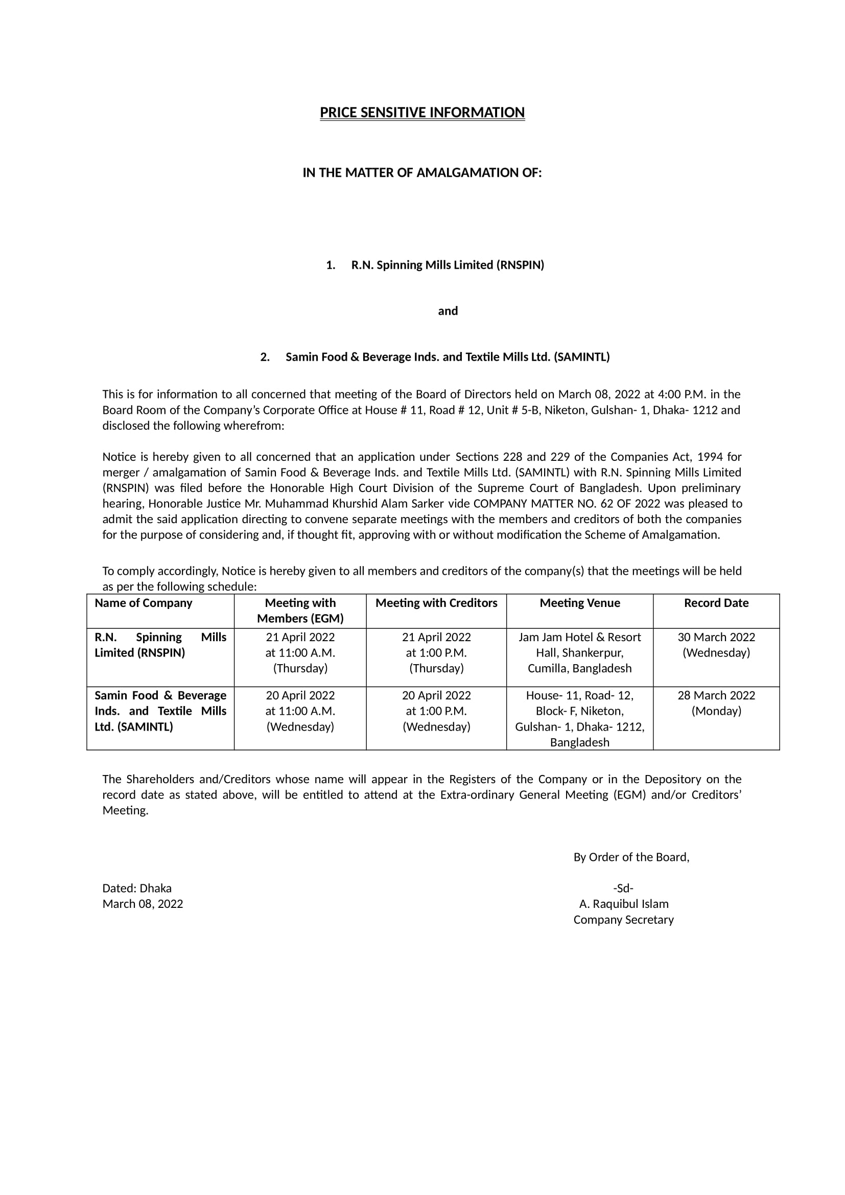 Price Sensitive Information of R.N. Spinning Mills Limited