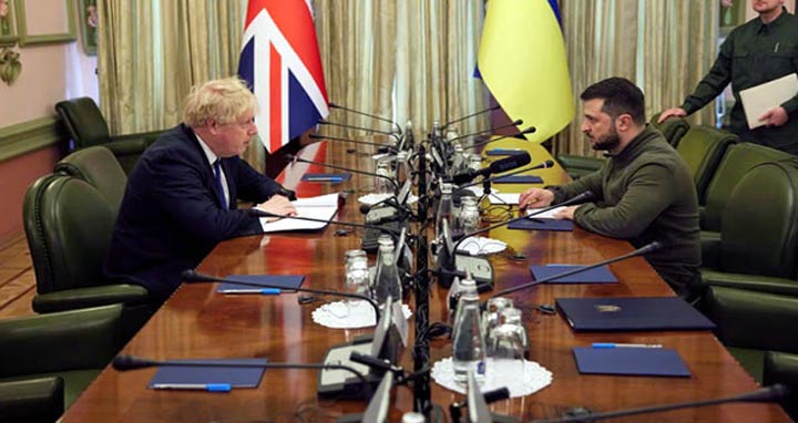 ইউক্রেনের প্রেসিডেন্ট ভলোদিমির জেলেনস্কির সঙ্গে দেখা করতে যুদ্ধবিধ্বস্ত দেশটিতে ঝটিকা সফরে গেলেন যুক্তরাজ্যের প্রধানমন্ত্রী বরিস জনসন। দেশটির রাজধানী কিয়েভে জেলেনস্কির সঙ্গে বৈঠকও করেন তিনি। দুই দেশের নেতাদের বৈঠকের ছবি ব্রিটেনে ইউক্রেনের দূতাবাসের তরফে টুইটারে পোস্ট করার পরেই বিষয়টি জানা যায়।