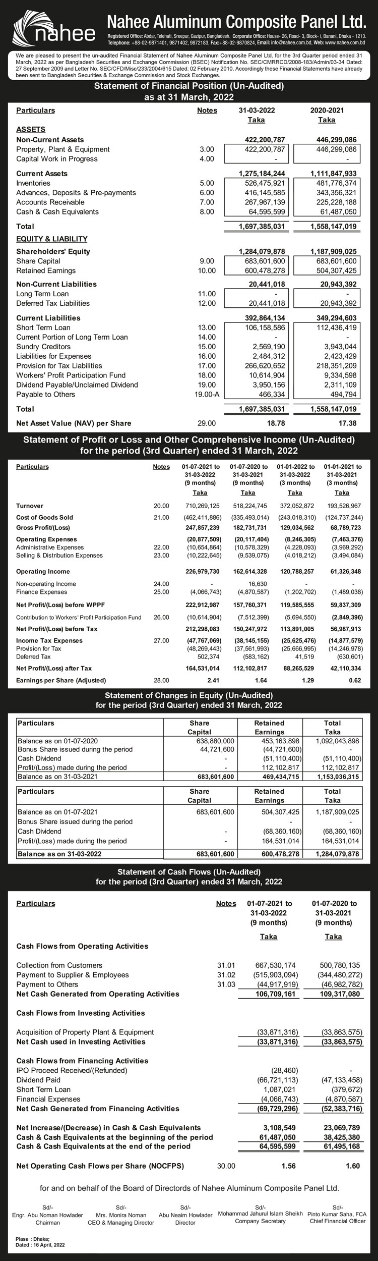 Statements of Financial Position (Un-Audited) of Nahee Aluminum Composite Panel Ltd