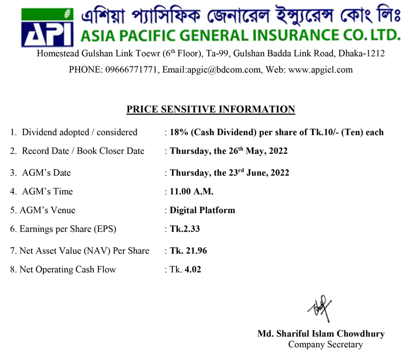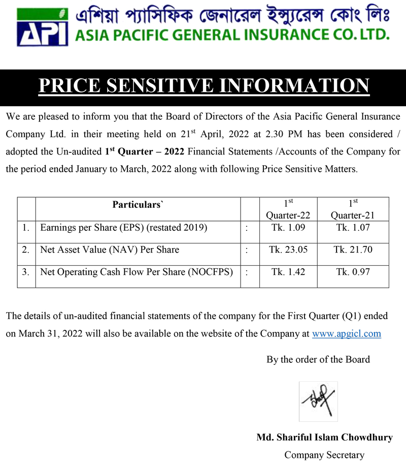 Price Sensitive Information of Asia Pacific General Insurance Co. ltd