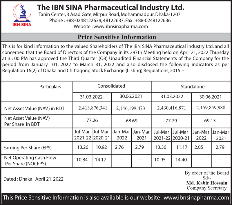 Price Sensitive Information (Q3) of The IBN SINA Pharmaceutical Industry Ltd.