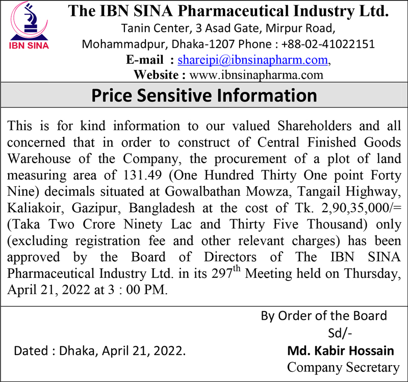 Price Sensitive Information of The IBN SINA Pharmaceutical Industry Ltd.