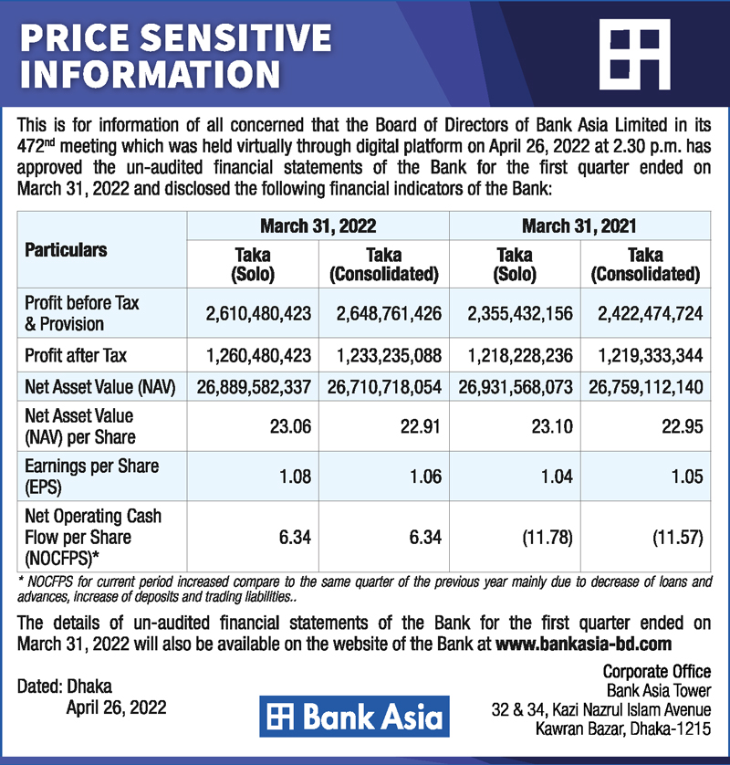 Price Sensitive Information of Bank Asia Ltd.