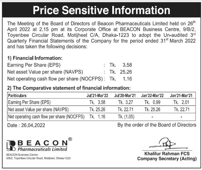 Price Sensitive Information of Beacon Pharmaceuticals Ltd.
