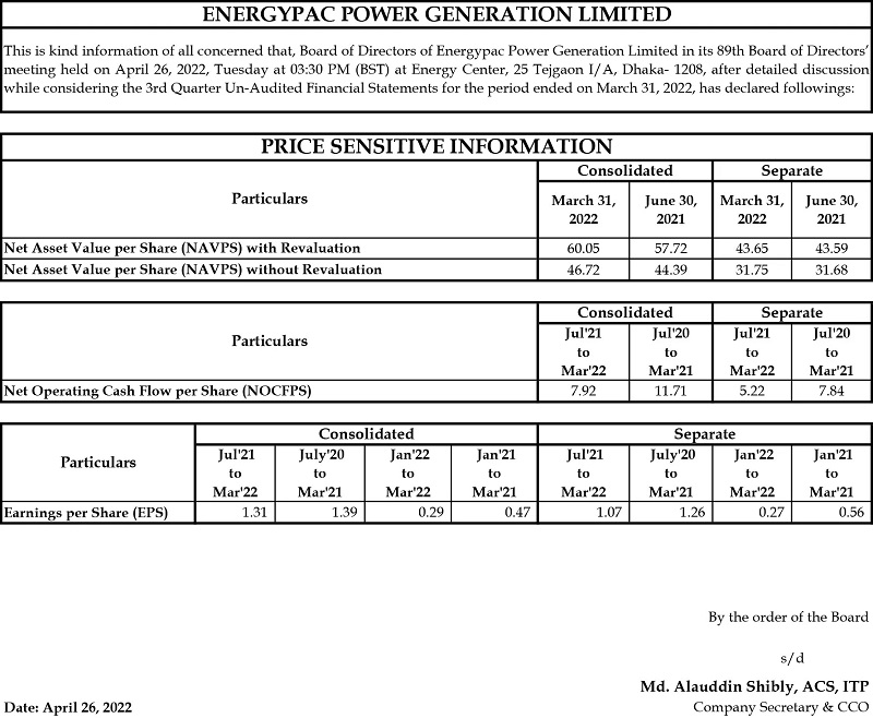 Price Sensitive Information of Energypac Power Generation Limited