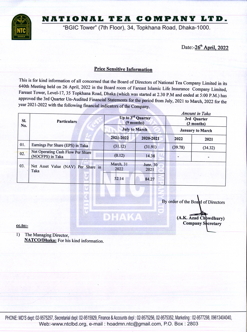 Price Sensitive Information of National Tea Company Lted.