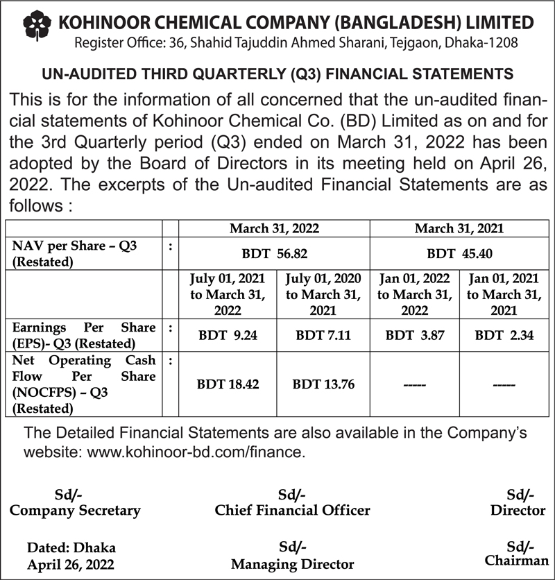 Un-audited Q3 Financial Statements of Kohinoor Chemical Company (Bangladesh) Limited
