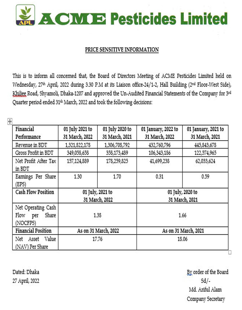 Price Sensitive Information of Acme Pesticides Limited