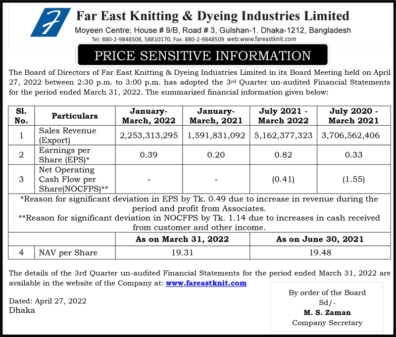 Price Sensitive Information of Far East Knitting & Dyeing Industries Ltd
