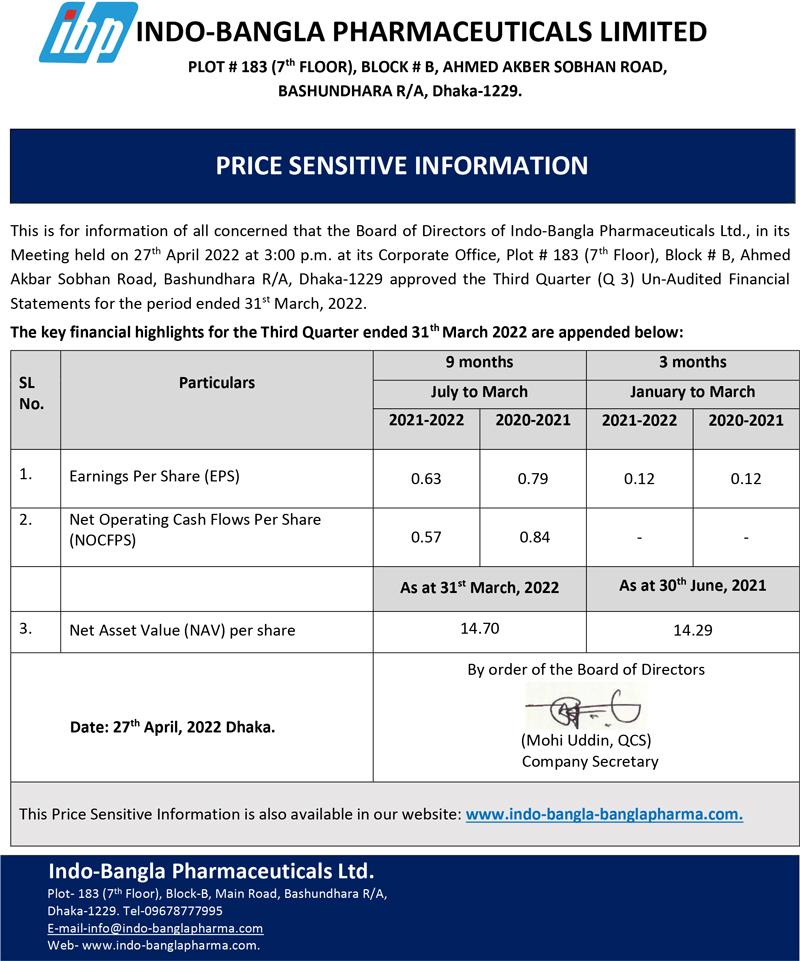 Price Sensitive Information of Indo-Bangla Pharmaceuticals Limited