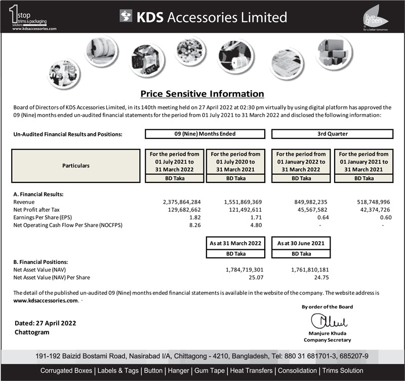 Price Sensitive Information of KDS Accessories Ltd.