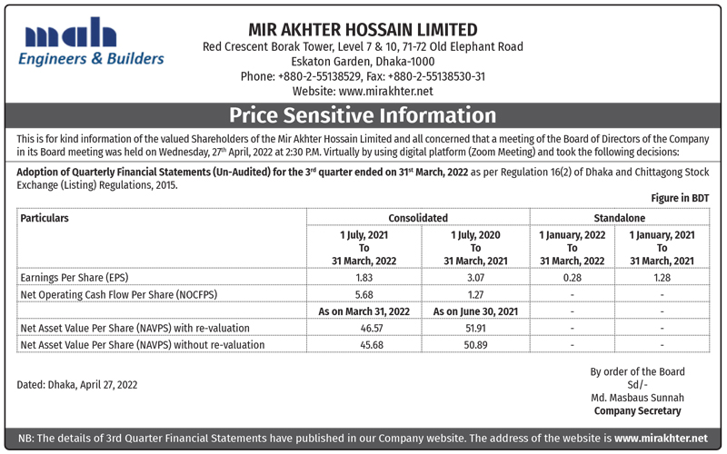 Price Sensitive Information of Mir Akhter Hossain Limited