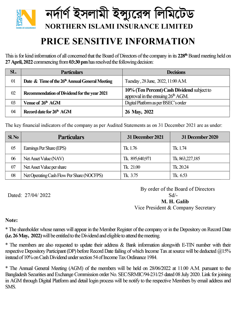 Price Sensitive Information of Northern Islami Insurance Ltd.