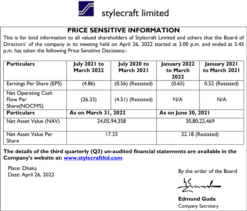 Price Sensitive Information of Stylecraft Limited