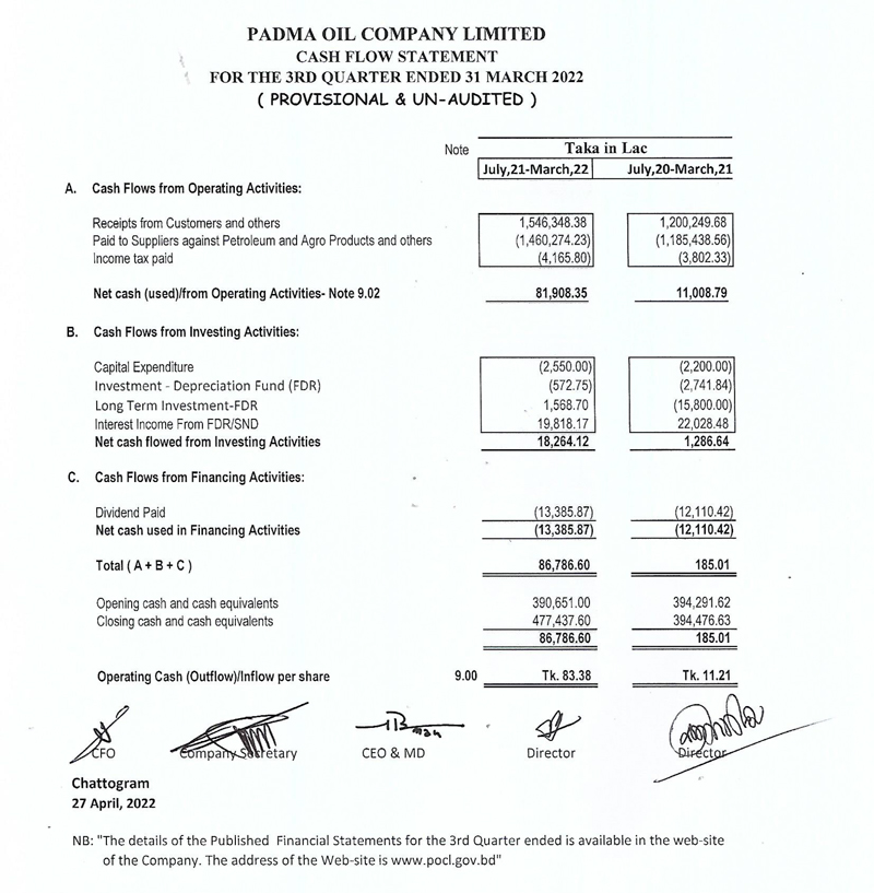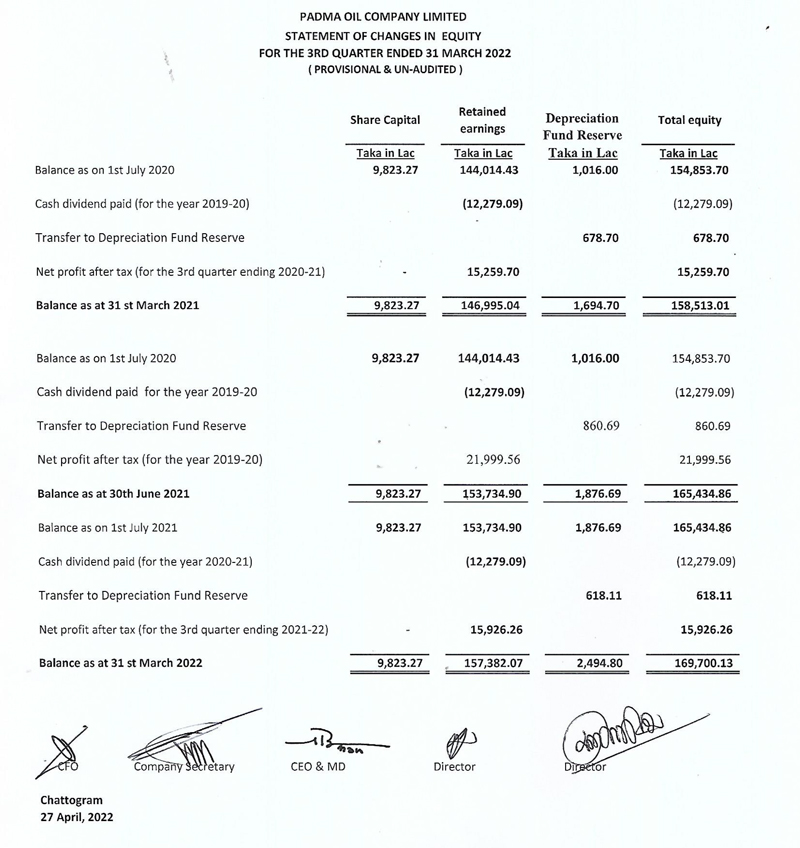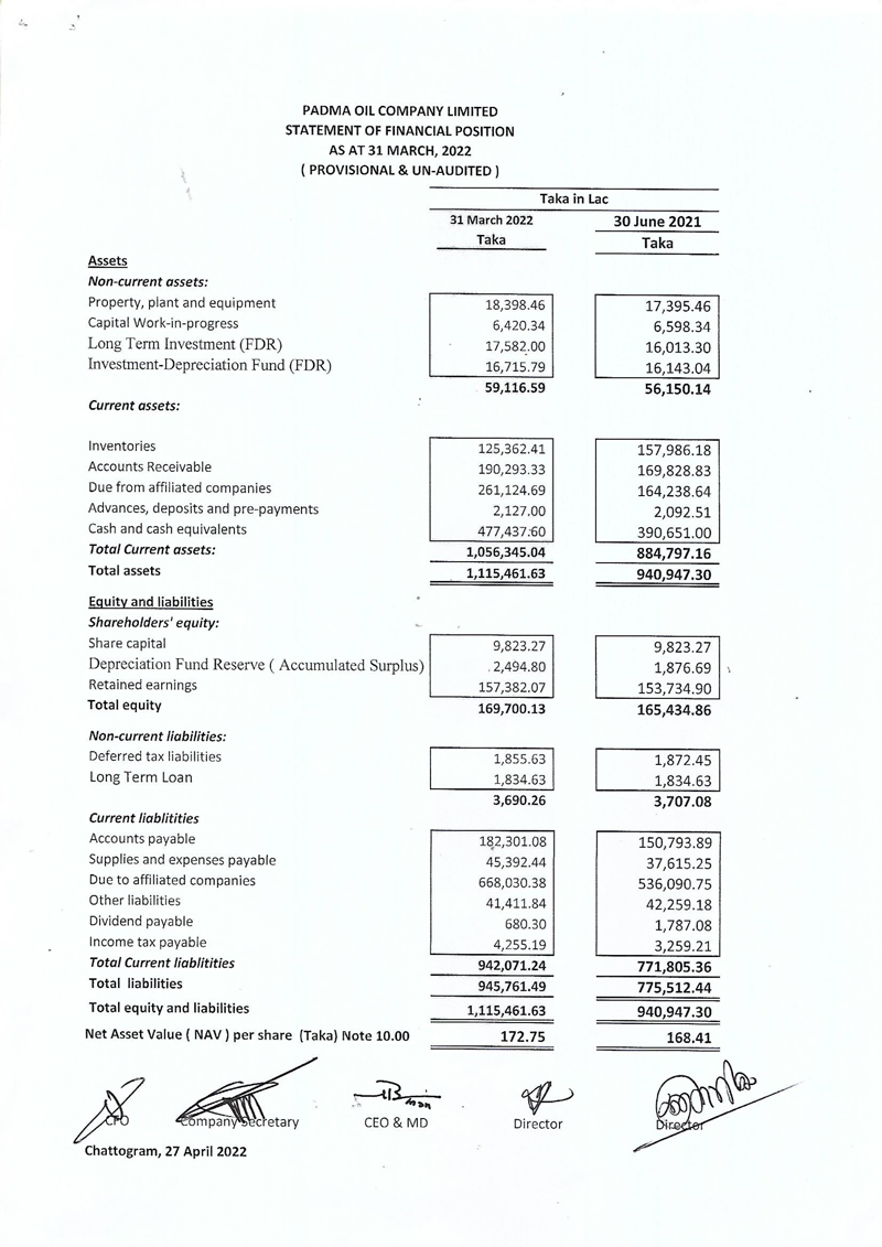 Statements of Financial Statements of Padma Oil Company Limtied
