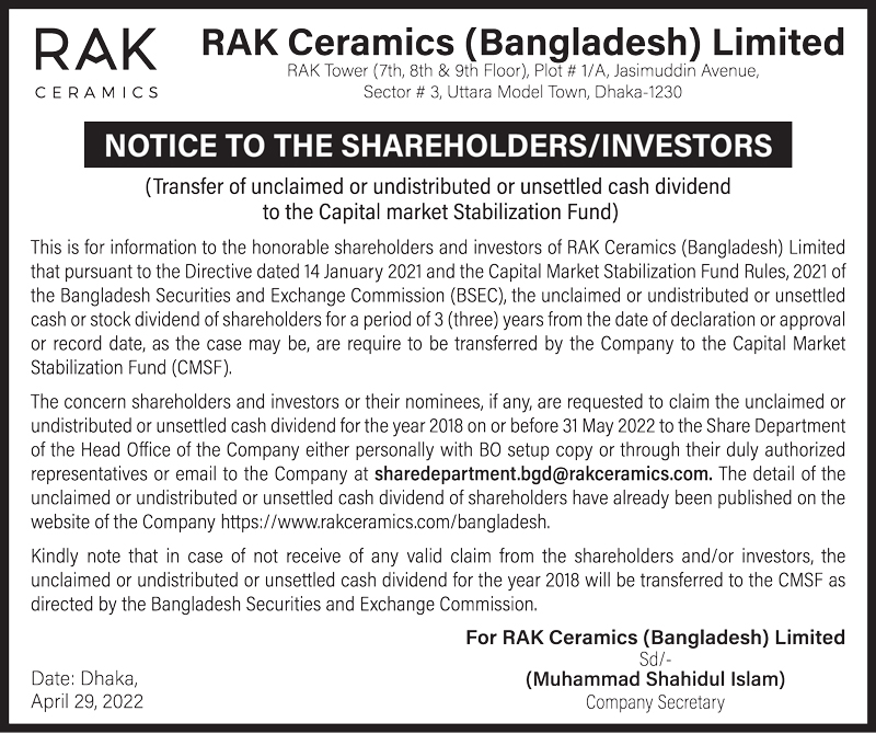 Notice to the Shareholders/Investors of RAK Ceramics (Bangladesh) Limted