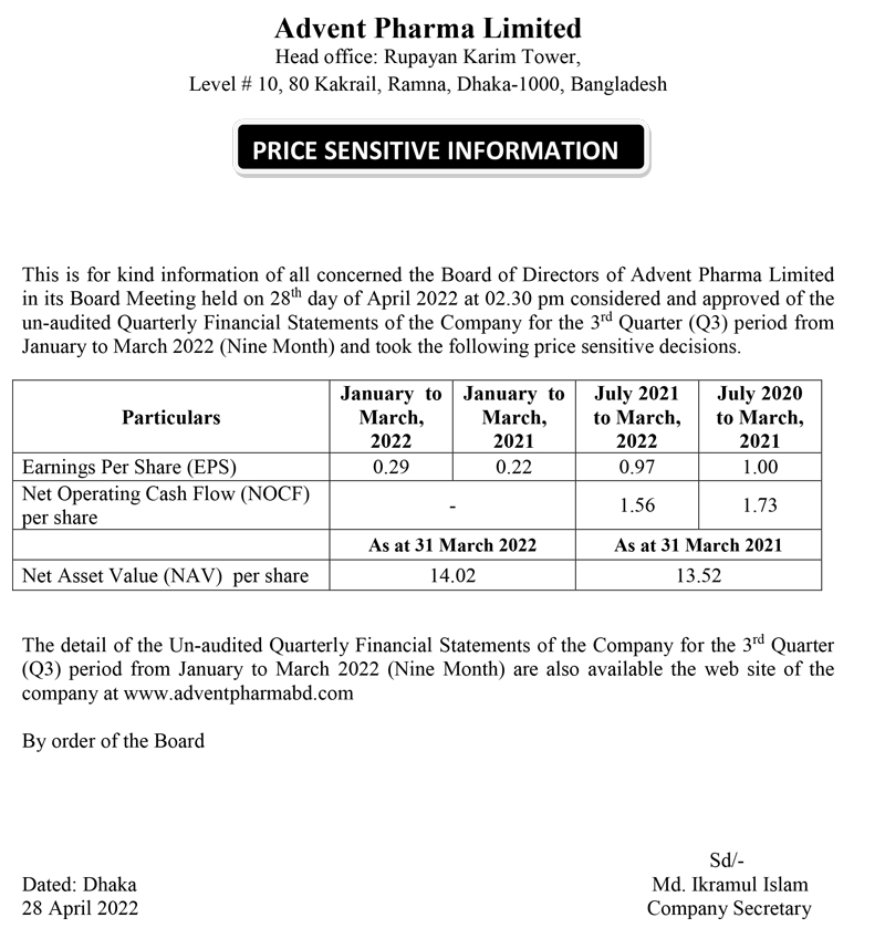 Price Sensitive Information of Advent Pharma Limited