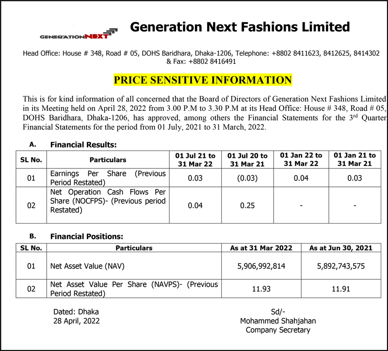 Price Sensitive Information of Generation Next Fashions Limited