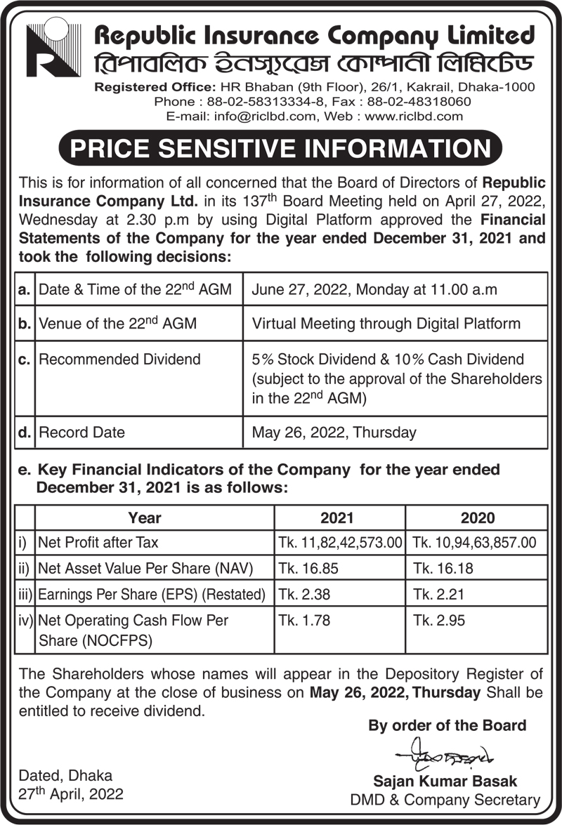 Price Sensitive Information of Republic Insurance Company Limited